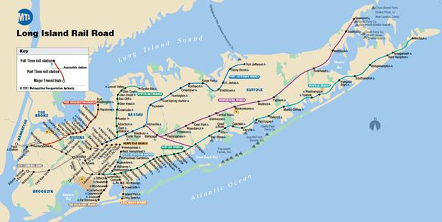纳苏郡在长岛的西边,与纽约市的皇后区(Queens)接壤,在曼哈顿与纳苏郡间有24小时运营的长岛铁路(Long Island Railroad,LIRR),一般乘坐火车40分钟之内便可达到曼哈顿的34街宾夕法尼亚火车站(Penn Station),火车站又直接与众多地铁线路相连,可以方便到达曼哈顿的各个角落。