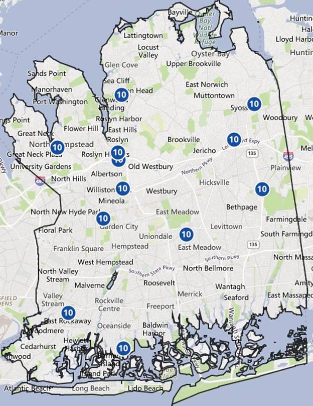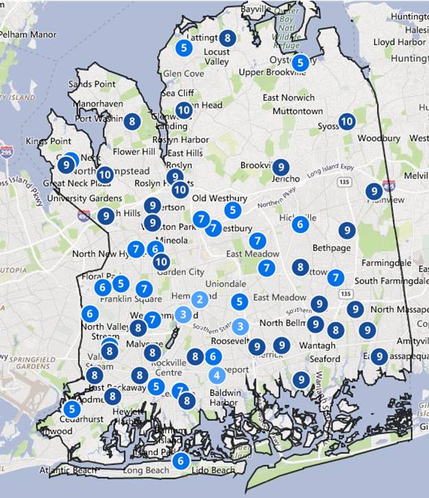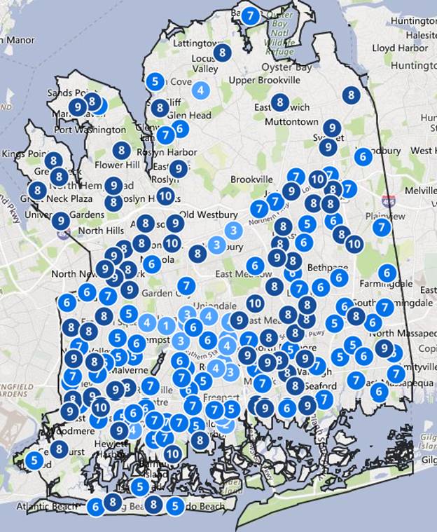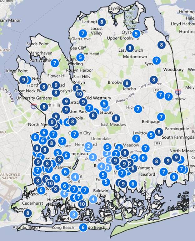 下面的地图显示了纳苏郡公立学校的评分。该评分来自于美国权威的学校排名机构Great Schools。评分主要综合了学生每门课的成绩以及学生入学前后的进步程度。评分的高低是以州内平均水平作为参考的相对分数。最高分为10分,最低分是1分。 1-3分的学校表示学校的质量低于州内的平均水平,4-7分表示学校的质量与州内的平均水平齐平,8-10分则表示是优质学区,质量高于州内平均水平。