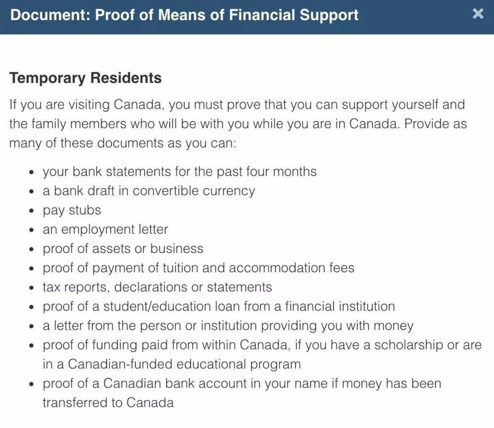 我们看到 IRCC 提供的在线签证申请通道,在“财力证明”这一项,可以看到系统列举出可用于递签的材料多达 11 种,而且已经都采用“proof of”这种开放性描述。