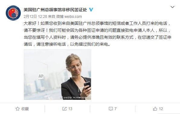 “大家好!如果您收到来自美国驻广州总领事馆的短信或者工作人员打来的电话,请不要惊讶!我们可能会因为各种签证申请的问题直接致电申请人本人,所以,当您在填写个人资料时,请务必提供准确且有效的联系方式,在您递交了签证申请后,请注意接听电话,以免错过我们的来电。”