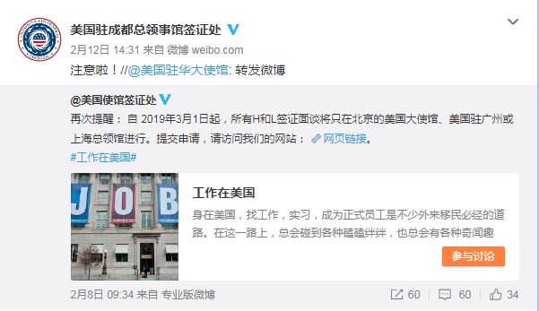 “自2019年3月1日起,所有H和L签证面谈将只在北京的驻华大使馆、美国驻广州或上海总领馆进行。美国驻成都和沈阳总领事馆将不再受理H或L类签证申请。”
